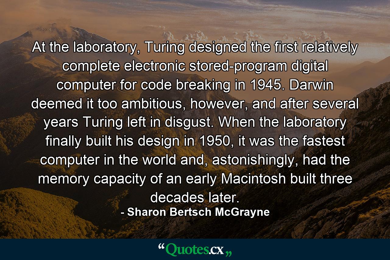 At the laboratory, Turing designed the first relatively complete electronic stored-program digital computer for code breaking in 1945. Darwin deemed it too ambitious, however, and after several years Turing left in disgust. When the laboratory finally built his design in 1950, it was the fastest computer in the world and, astonishingly, had the memory capacity of an early Macintosh built three decades later.